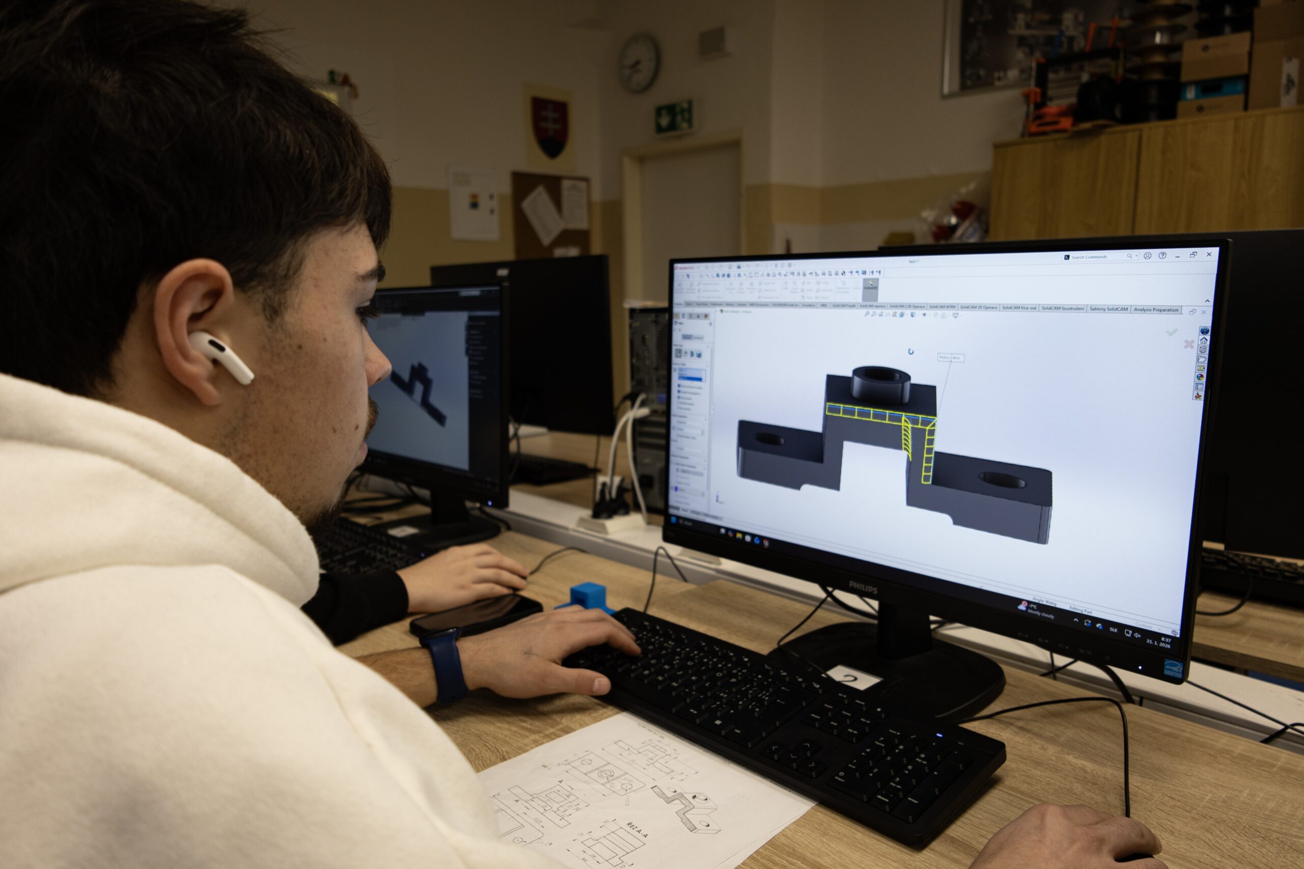 Mezi činnosti, se kterými se žáci u nás ve výuce dosud nesetkali, patřila také práce na CNC strojích. Ta chlapce nadchla nejen samotnou prací na stroji, ale i 3D modelováním jako takovým. Dále si vyzkoušeli tvorbu jednoduchého zabezpečovacího systému pomocí kamerových technologií.