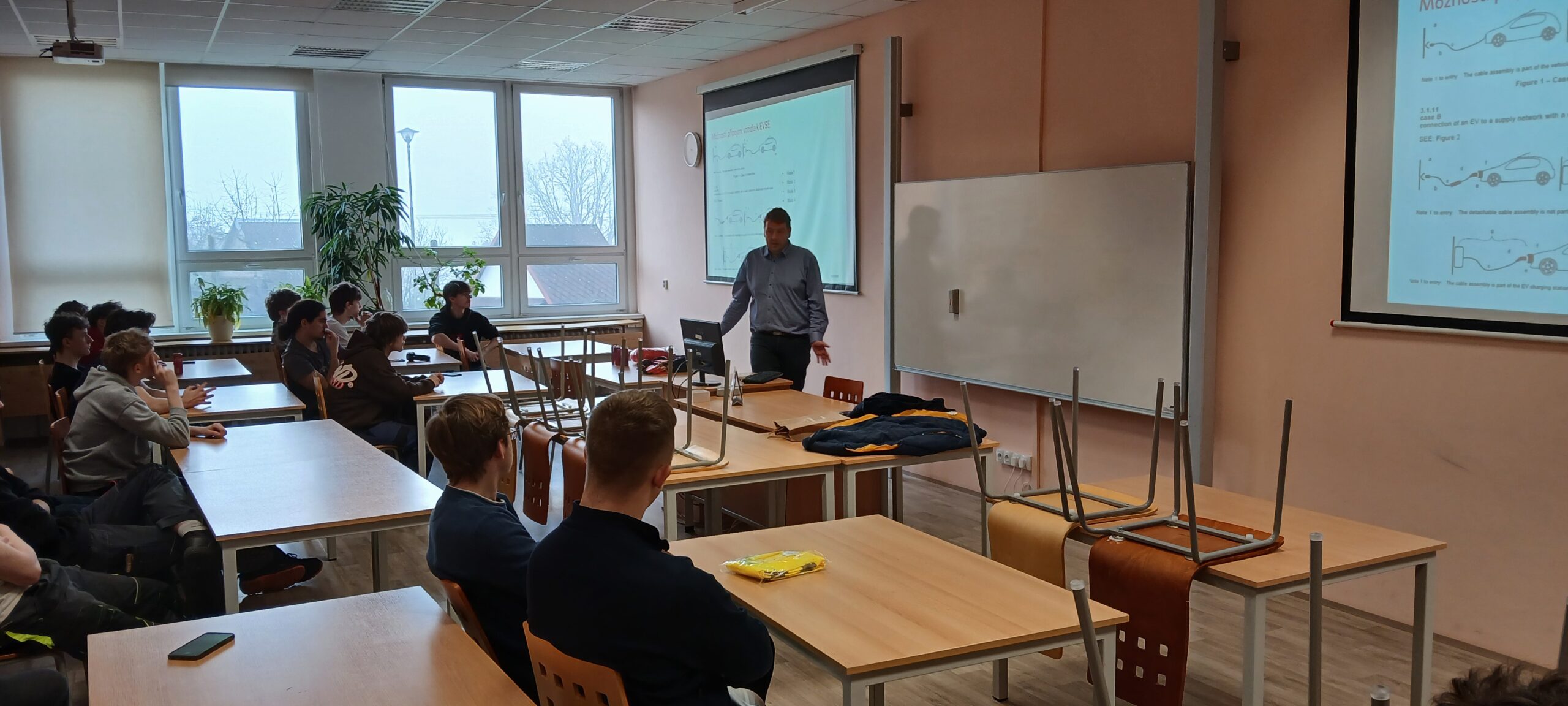 Přednášející vysvětlil žákům SE3 výhody a nevýhody elektromobility, nabíjení stejnosměrné, střídavé a výstavbu nabíjecích stanic.